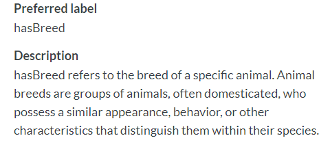 Within this graph, we have made our semantics explicit by defining not just the data but also the model that our data follows. The graph also captures the data concept information that we would want to find in a data dictionary. If we want to know more about any part of this model – for example, what the relationship “hasBreed” refers to – we can navigate to that part of the model and find out more information: