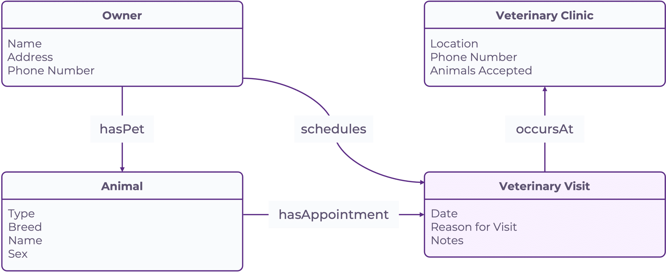 What the data describes can be captured by modeling the most important things (or entities) that the data is describing. Looking at our veterinary clinic data, let’s pull out these entities, their information, and the links between them: