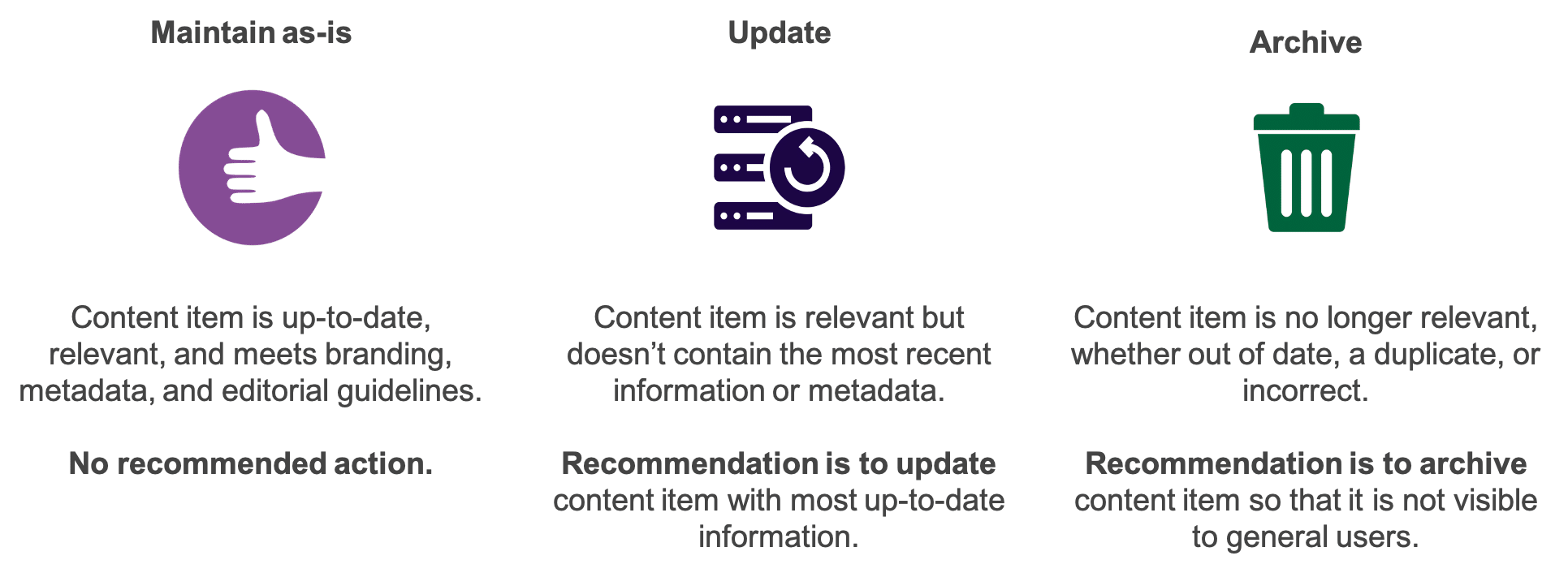 - EK analyzed the organization’s content against 6 evaluation parameters to determine what content needed to be updated, archived, or maintained-as-is. This resulted in an actionable content inventory, clean-up, and migration plan for the organization to systematically clean-up their content before migration.