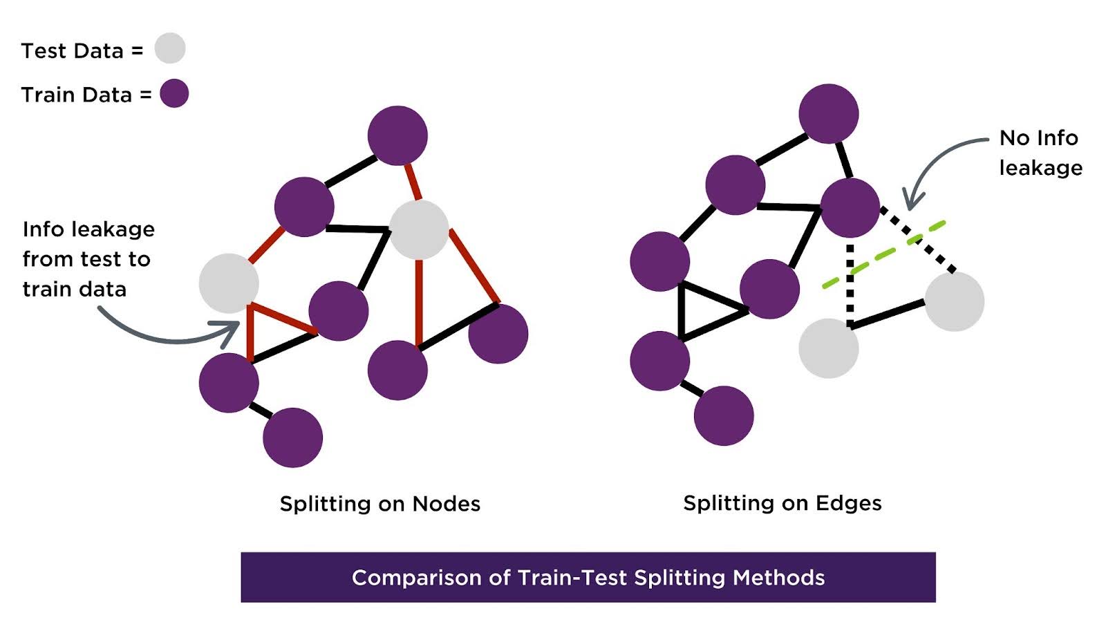 Business Value: Random or node-based splitting can place connected nodes across sets, allowing information to leak via edges. Edge-based splitting prevents information leakage between training and test sets, preserving the integrity of graph relationships and delivering reliable, unbiased predictions.