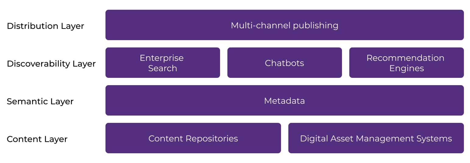 When that content is modeled and structured in the source systems, it can be enriched with metadata at the component level. The structure of content in a content repository plays a crucial role in facilitating data organization and abstraction within the semantic layer regardless of its original format or source. By incorporating the content metadata into a common semantic framework with other types of data, the semantic layer enables integration and interoperability between different data types, allowing users to access and leverage all relevant information from a single source. That source is then optimized for the kind of system that consumes it, whether a web content management system, a learning management system, a marketing campaign management system, or another use case.