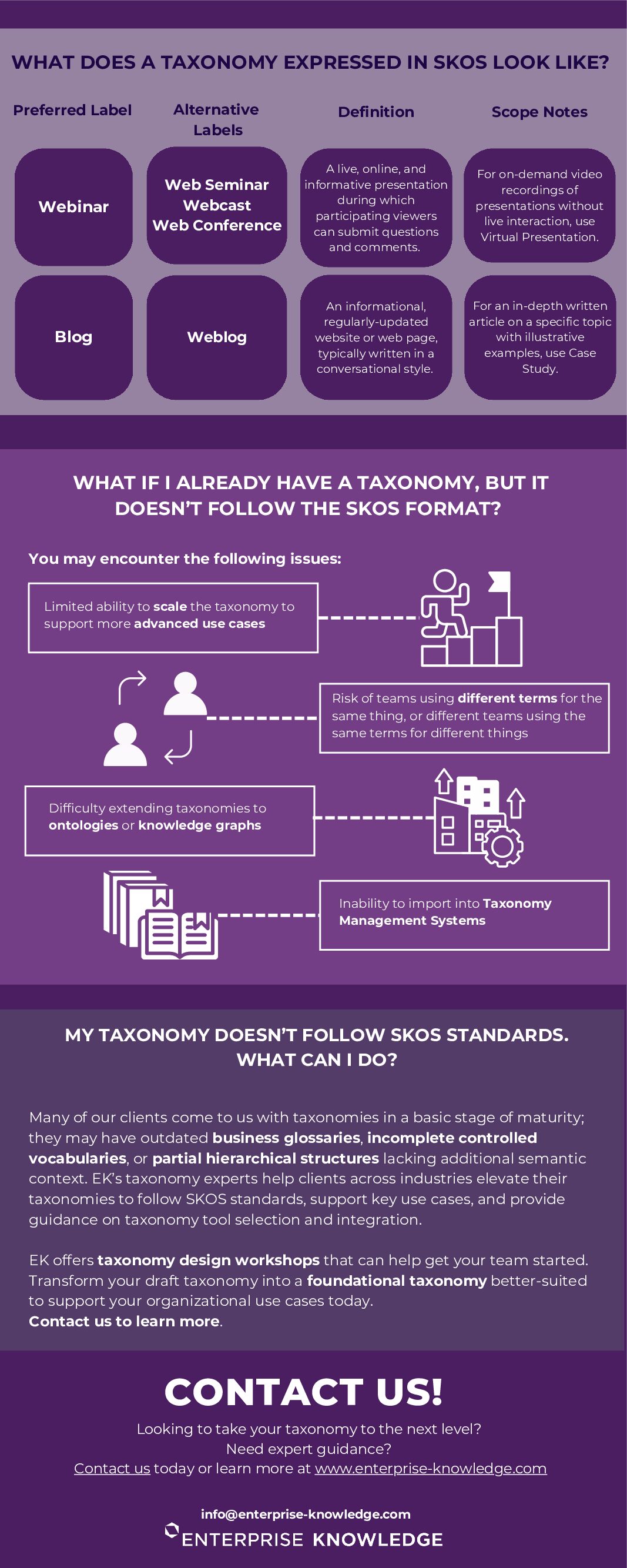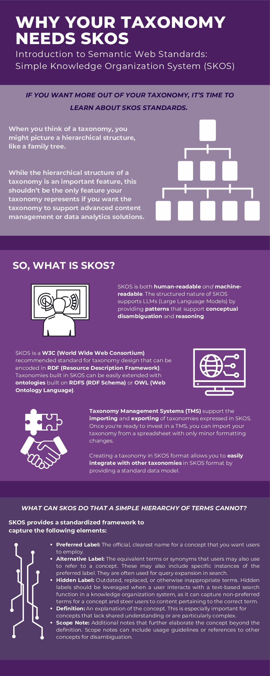 Taxonomies are a valuable tool for capturing semantic context, but their full value can only be realized when they’re represented in a standardized format. This infographic introduces SKOS (Simple Knowledge Organization System) and demonstrates how your organization’s taxonomies can reach their full potential.